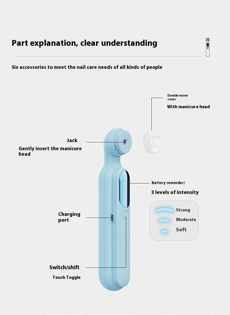 Nail Clipper X1, Usb Charging Cable X1, Double Month Cover X1, Quick Repair Head X2, Professional Head X1, Care Head X1, Cleaning Head X1, Polishing Head X1, Instruction Manual X1